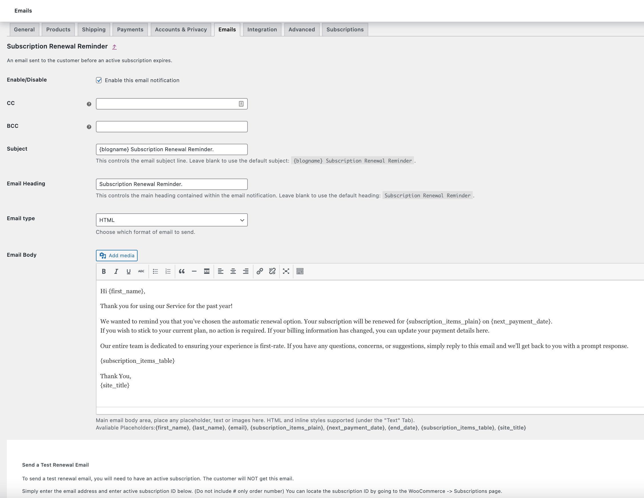 WooCommerce Subscription Renewal Reminder is fully integrated with the woocommerce email template system. This allows you to easily override the reminder email template in your theme.