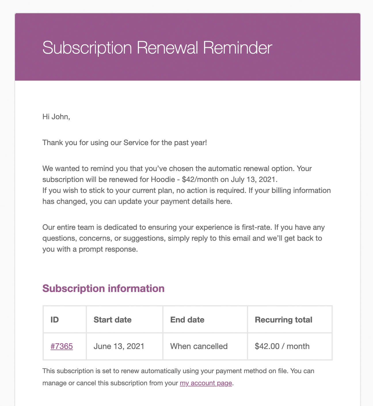 Default email template for the WooCommerce Subscription Renewal Reminder email. Colors and logo will display according to your WooCommerce settings.